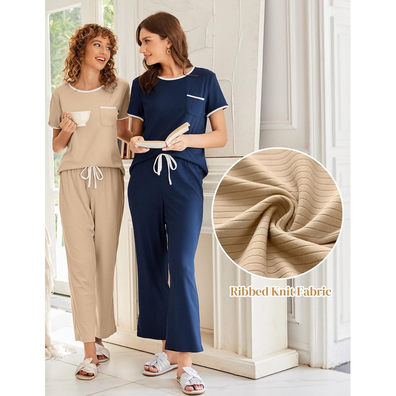 Ekouaer Women Lounge Pajamas Sets Ribbed Knit PJ Short Sleeve and Long Pajama Pant Soft 2 Piece Sleepwear Loungwear Clear Blue