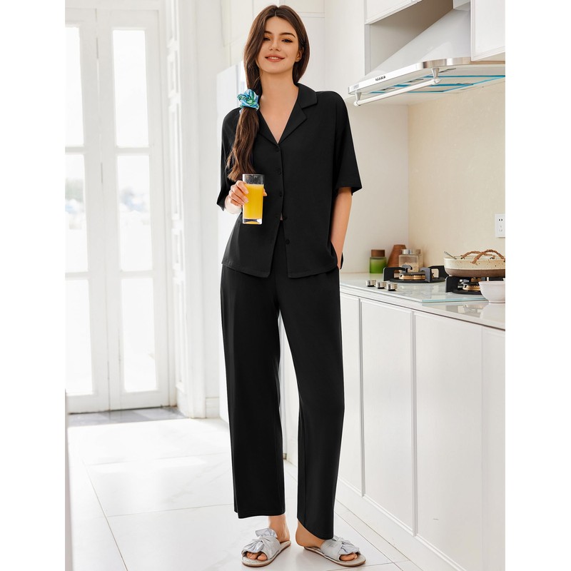 Ekouaer Women Pajamas Set Button Down Sleepwear Short Sleeve Pjs Soft Comfy Nightwear with Long Pants,Black,XL