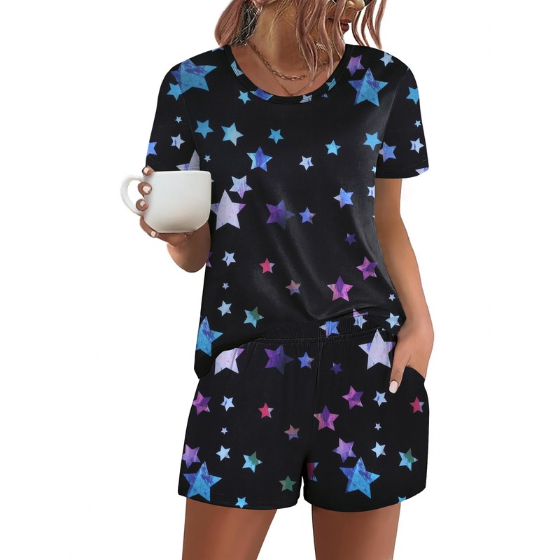 Ekouaer Women's Pajama Sets Short Sleeve Pjs 2 Piece Top and Shorts Sleepwear Comfy Soft Lounge Sets with Pockets Black Star Medium