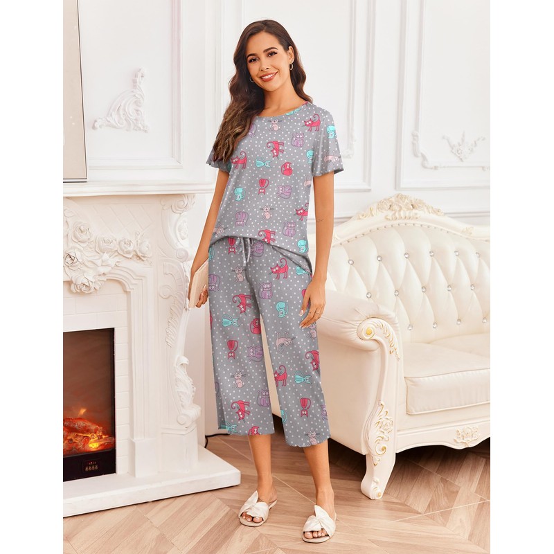 Ekouaer Women's Pajamas Set Short Sleeve Sleepwear 2 Piece Round Neck Top Capri Pants Loungewear with Pockets Gray/White Pot/Cat M