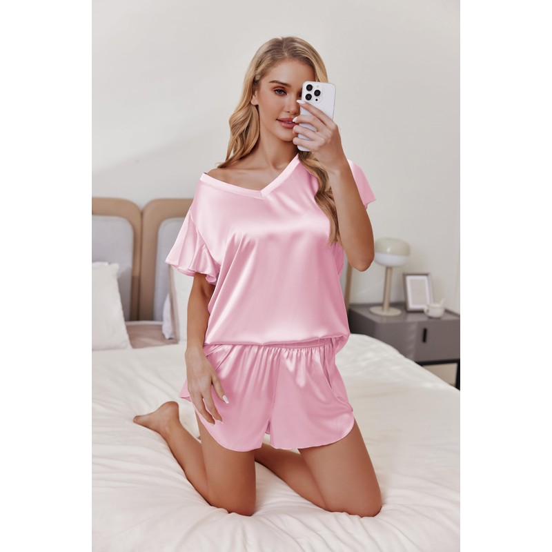 - 【FUTURES】Silk pjs for women features classic v neck,ruffle sleeve.The elegant and slim fitting satin shorts are designed with elastic ruffle edges and adjustable elastic fit any body.Loose cut can show your body curve while giving you a burden-free wearing experience