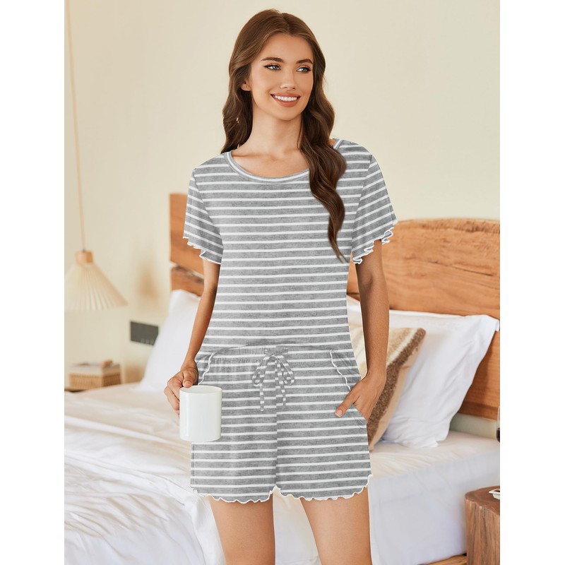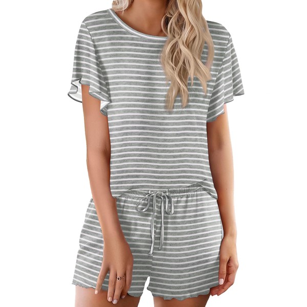 Ekouaer Womens Pajama Set 2 Piece Lounge Set Short Sleeve Pjs Tops and Shorts Soft Sleepwear,Gray/White Stripe,Large