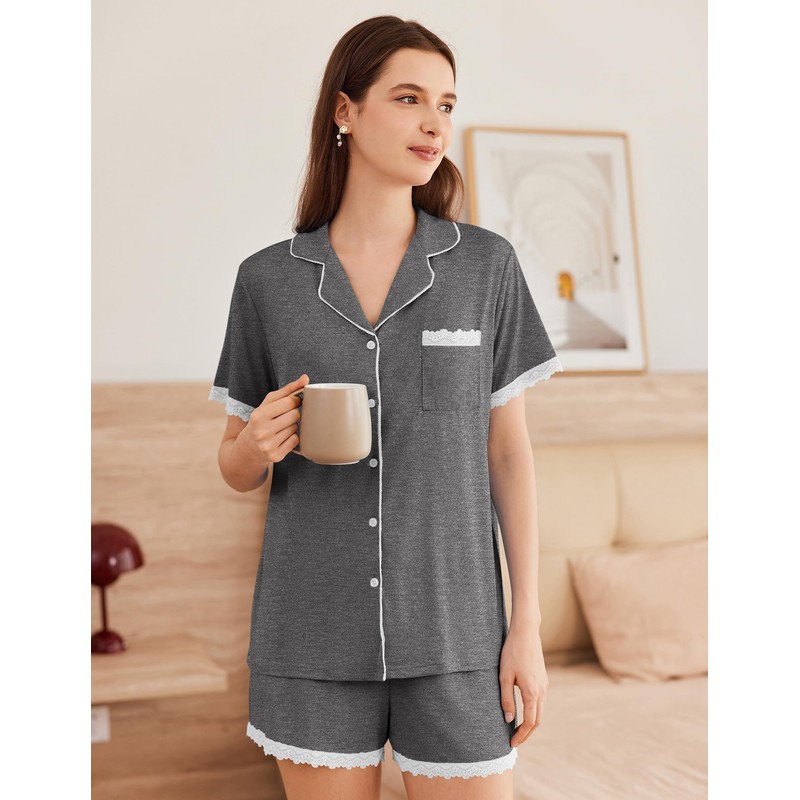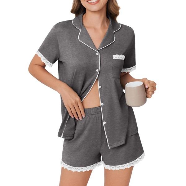 Ekouaer Womens Short Sleeve Pajamas Set Soft Sleepwear Button Down Lounge Set Lace Top and Shorts Pj Nightwear Deep Grey