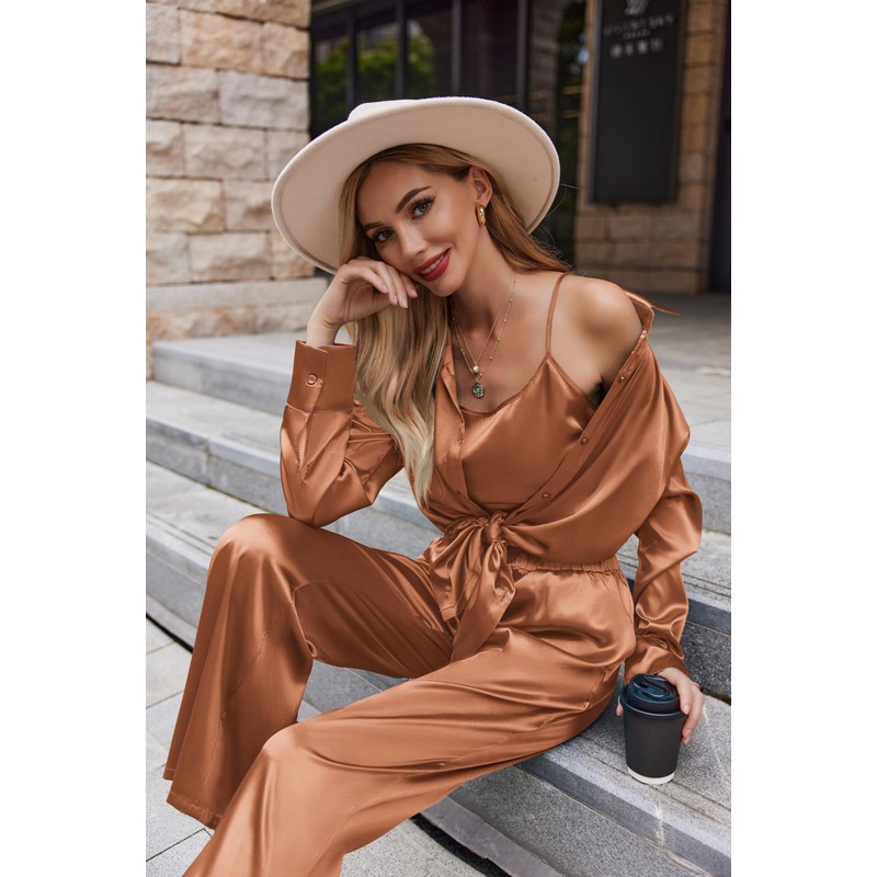 - 3 PIECE SATIN LOUNGE SET: Womens Silk camisole top + high-elastic satin pants, trousers with slip pockets. Button-down shirt can be used as a sleepshirts. The whole pajamas set has a casual, lazy and loose cut, easy to put on and take off