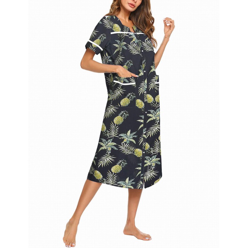 Ekouaer Womens Snap Front Dusters Cotton Housecoat Short Sleeve Nightgown House Dress With Pockets Black Pineapple XXL