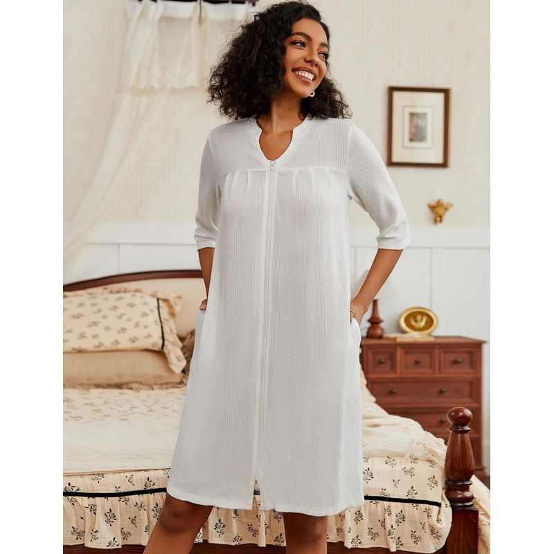 Ekouaer Zipper Robes for Women 3/4 Sleeve Waffle Knit Bathrobe Lightweight Short Housecoat with Pockets Soft Loungewear