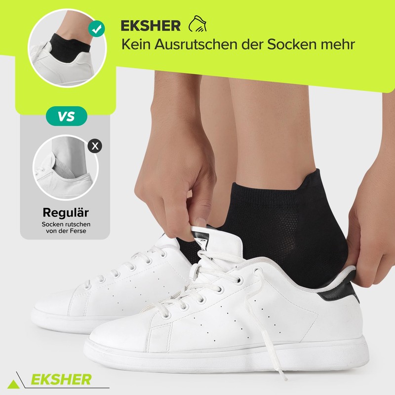• EKSHER Sneaker socks solve problems such as slipping socks and blisters on the heels during sports. The extended heel design not only ensures that the trainer socks are fixed to the heel and do not slip, but also prevents blisters and chafing when running.