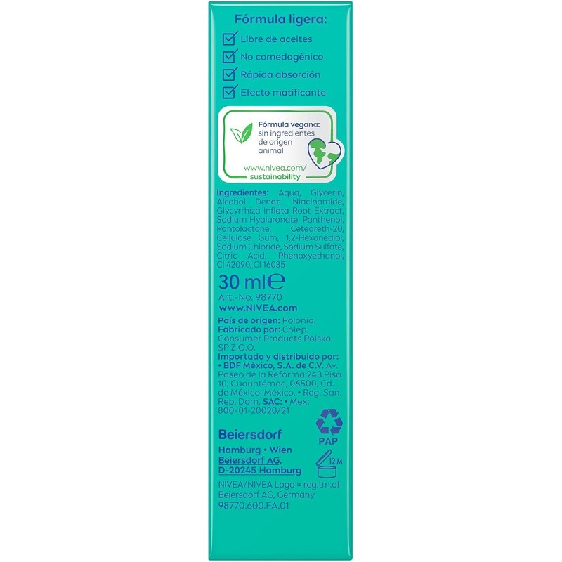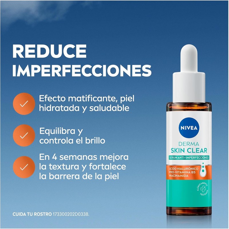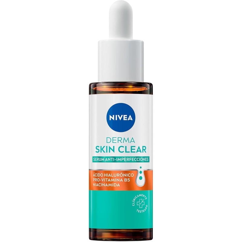 El nuevo NIVEA Derma Skin Clear Serum Anti-Imperfecciones, disminuye imperfecciones, puntos negros y espinillas. Mejora la textura de la piel gracias a su fórmula concentrada con Ácido Hialurónico, Pro-Vitamina B5 y Niacinamida, ideal para piel con tendencia al acné. Al instante, se observa el efecto matificante, piel hidratada y de aspecto saludable.En 7 días se observa la piel más uniforme y reducción de imperfecciones.En 4 semanas mejora la textura y fortalece la barrera de la piel.