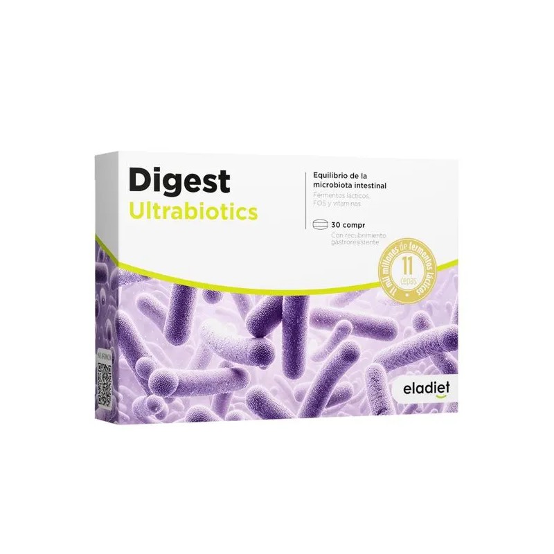 Eladiet Digest UltraBiotics is a nutritional supplement that contains a specialized combination of 11 probiotic strains to maintain the health of the intestine and the balance of the intestinal flora. Its composition is enhanced with fructooligosaccharides that have a strong prebiotic effect, as well as with vitamins B1, B2, B6 & B12.