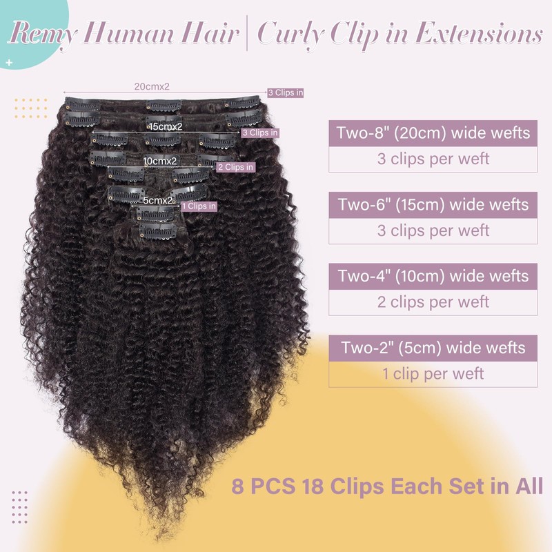 - 8 pieces with 18 clips: This extension includes 8-piece set and 18 clips, two 20 cm wide wefts with 3 clips each, two 15 cm with 3 clips each, two 10 cm with 2 clips each, two 5 cm with 1 clip each. Each piece is double thickened.