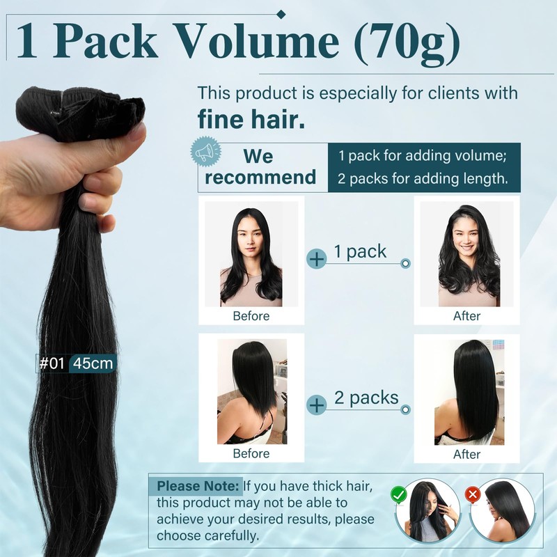 - Set contents and specifications: 1 x 20 cm wide wefts with 4 clips, 1 x 15 cm wide wefts with 3 clips, 2 x 10 cm wide wefts (2 clips each), 1 x 5 cm wide weft with 1 clip, instructions for use, sewing kit, replacement clips x 2. A package of hair is not much, suitable for guests with fine hair. We recommend our shop 8 pieces clip-in hair extensions double weft for guests with more hair volume.