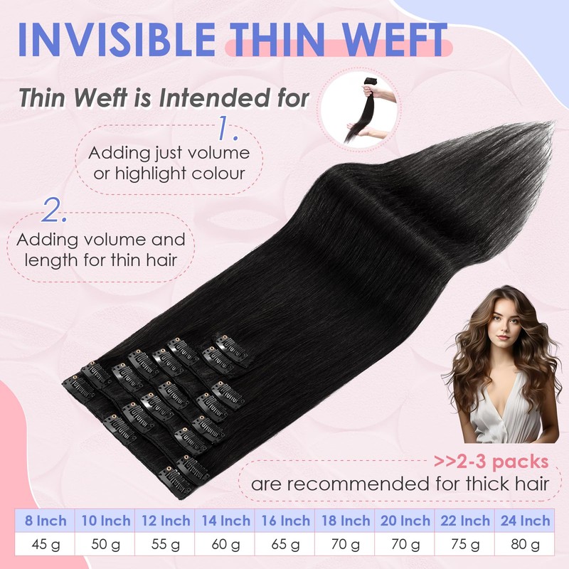 Elailite Hair Extensions Clip in Real Hair Remy Natural Human Hair - 8 Pieces Invisible Thin Weft Straight - #1 Jet Black - 14 Inch (60 g)