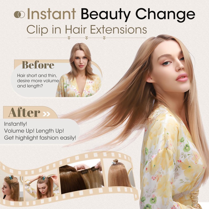 Transform your look with our clip-in hair extensions real human hair! Designed for those who desire instant length and volume, our real hair extensions clip in human hair are crafted from high-quality, 100% Remy human hair. This ensures a natural appearance and allows for easy blending with your own hair.