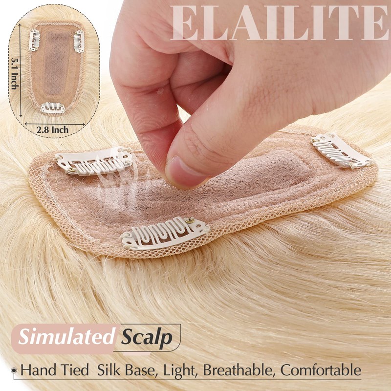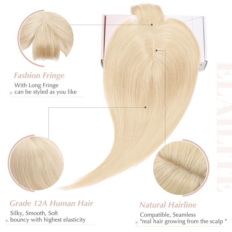 Elailite Hair Toppers for Women Real Human Hair Topper with Bangs Thinning Thin 5.1"x2.8" Silk Base Clip in Remy Hairpieces 12 Inch Platinum Blonde