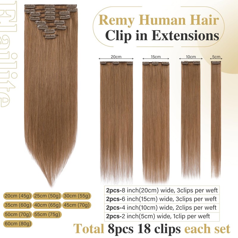 - 💎 Normal weft: 8 wefts (hair pieces), 18 clips: 2 x 20 cm wide wefts (3 clips each), 2 x 15 cm wide wefts (3 clips each), 2 x 10 cm wide wefts (2 clips each), 2 x 5 cm wide wefts (1 clip e