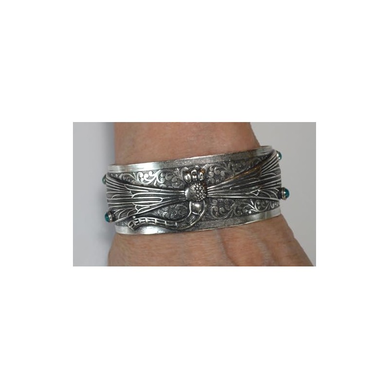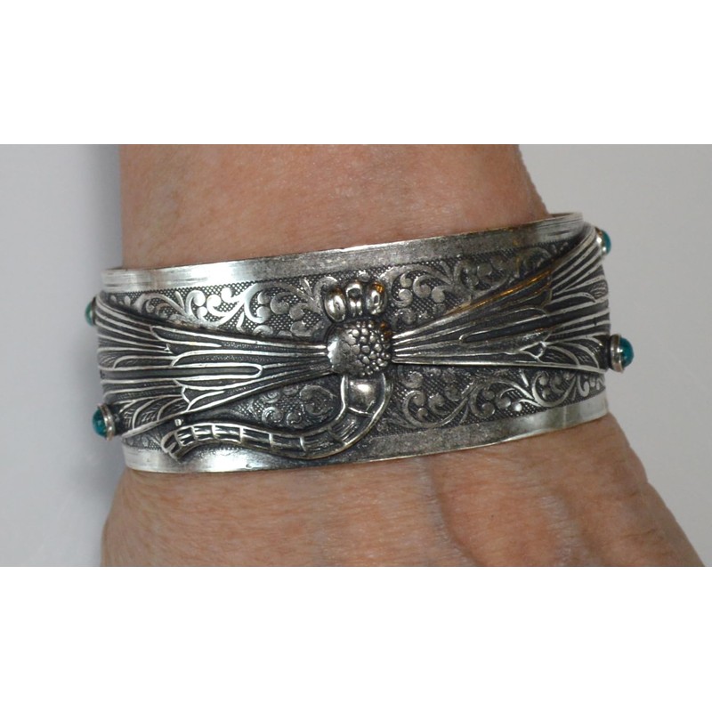 - Antique Silver Plated Solid Brass Decorative Dragonfly Cuff Bracelet - Chrysocolla Made in the USA