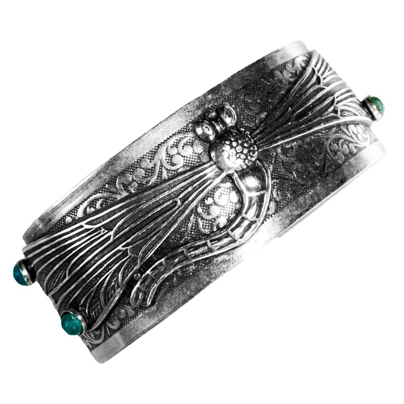 - A Solid Brass Decorative Dragonfly Cuff plated in antique silver with genuine Chrysocolla Cabochons.