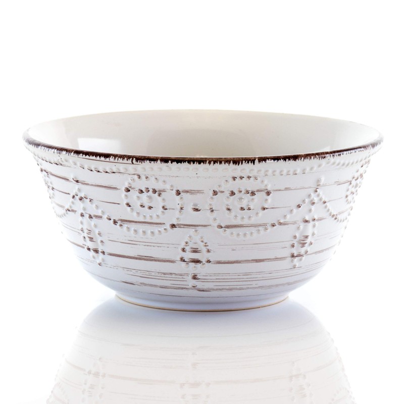 - ◈A STUNNING ACCENT TO YOUR TABLE◈ The Elama Rustic Birch 16 Piece Embossed Scalloped Stoneware Round Dinnerware Set in White with Brown Accents