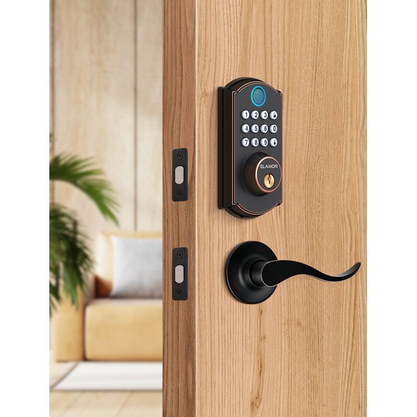 ELAMOR M19 Fingerprint Door Lock with 2 Lever Handles, Keyless Entry Door Lock, Automatic Locking, Easy to Install, Electronic Keypad Deadbolt with Code, Front Deadbolt Handle Sets, Oil Rubbed Bronze