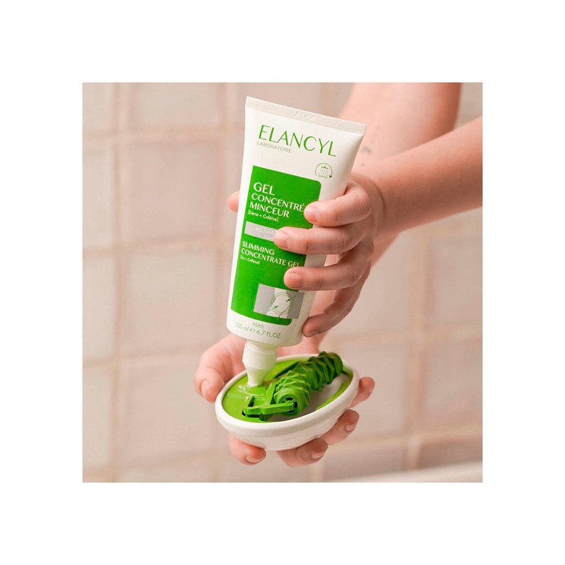 Fill the compartment of the device with Concentrated Gel. Use the ELANCYL massage device in accordance with the professional method executed by a physiotherapist.Always massage in an upwards direction from the outside to the inside.A cross massage on the abdomen, buttocks and arms is recommended. Daily massage in the shower for 28 days.