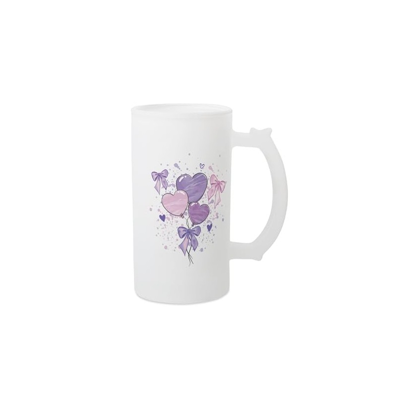 Elanze Designs Cute Freezable Beer Stein Mug With Thumb Grip Handle 16 Ounce Frosted Glass, Purple Heart Balloons With Coquette Bows