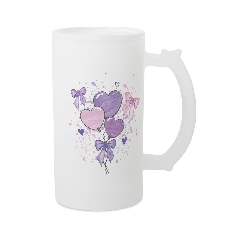 Elanze Designs Cute Freezable Beer Stein Mug With Thumb Grip Handle 16 Ounce Frosted Glass, Purple Heart Balloons With Coquette Bows