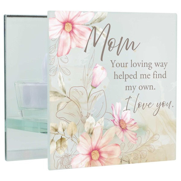 - Bring a touch of warmth and inspiration to your home with our Tabletop Tealight Candle Holder; Front panel features a floral design with the sentiment: 'Mom - Your loving way helped me find my own. I love you'