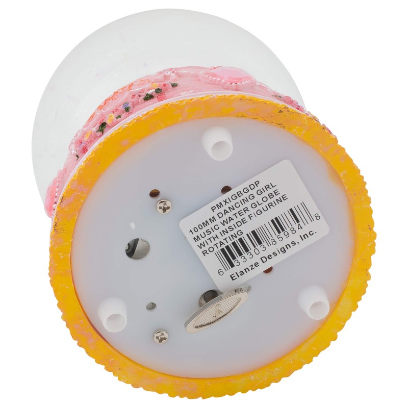 - Figurine depicts a ballerina fairy in a pink tutu that actually rotates inside the globe while music plays. Pedestal base is made of resin polymer stone material with jeweled bead accents.