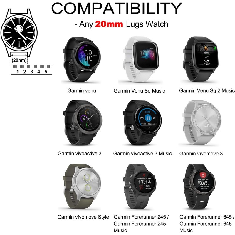 - ★【Compatible Models】Wanme 20mm Quick Release replacement Straps Compatible with Garmin Vivoactive 5 /Garmin Approach S12/Garmin Venu Sq/Garmin Venu Sq music/Garmin Venu/Garmin Venu 2 Plus/Garmin Forerunner 245/Garmin Forerunner 245 music/Garmin Forerunner 645/Garmin Forerunner 645 music/Garmin Vivoactive 3/Garmin Vivoactive 3 Music(Note: Please Check Your Watch Model Before Buy It. And No Smart Watch Included)