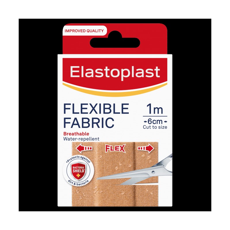 Elastoplast Flexible Fabric Wound Dressing Plaster with Elastoplast Bacteria Shield* is a flexible and breathable fabric strip that you can cut to the size you need. This water repellent plaster is able to cover and protect minor wounds against dirt and bacteria. It is suitable for covering all types of smaller, everyday wounds such as scratches, cuts and grazes whilst the material stretches with your skin's movements - making them appropriate for use over joints and other moveable parts of the body. The non-stick wound pad helps to ensure that the wound is cushioned and protected while the strong adhesive plaster stays in place. At 1m x 6cm, there is plenty of plaster to cut to the size you need for your wound. The plaster also contains 0% latex.