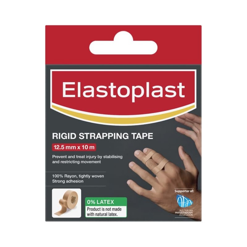 Elastoplast Rigid Strapping Tape 12.5mm x 10m provide maximum stability to prevent and treat injuries by restricting movement. With strong adhesion and 100% rayon construction, this tape provides maximum support during activities and is latex free.