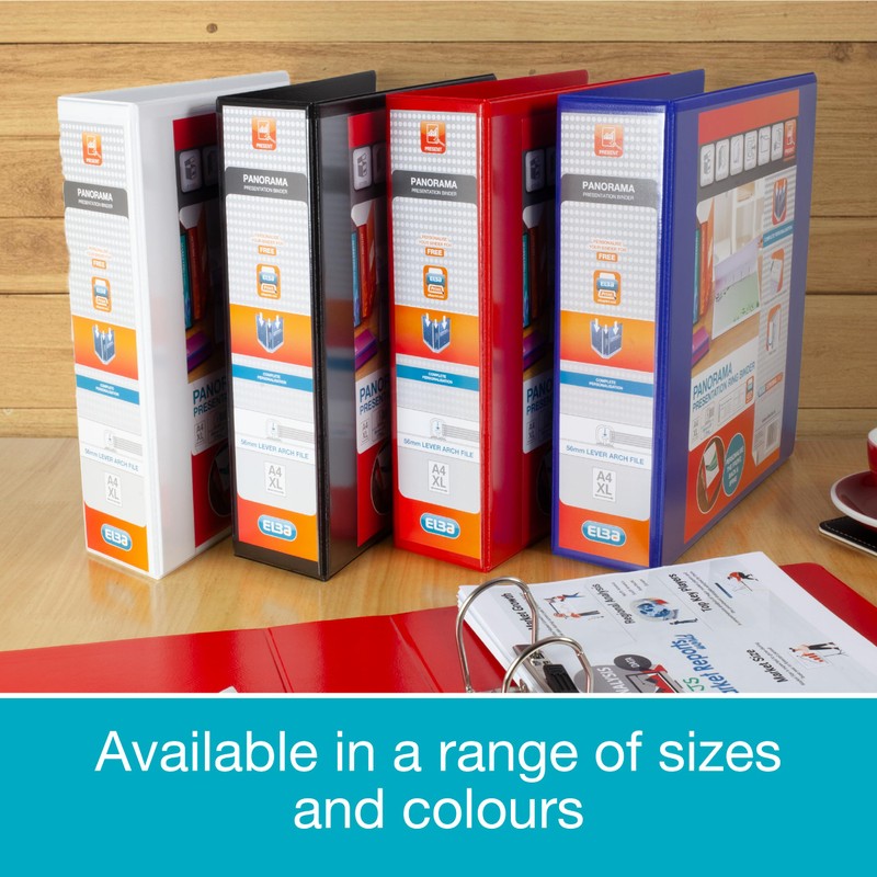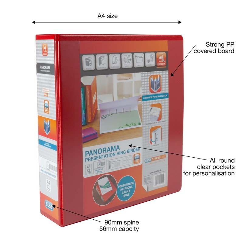 Elba A4 2 O-Ring Lever Arch File, 56mm capacity, 90mm spine, Presentation Folder with Customisable Cover, Portrait, Red (Single)