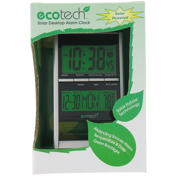 Solar Hybrid Alarm Clock / Blue Backlit LCD / Displays Time, Month, Date And Alarm Time