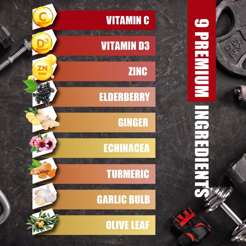 • Elderberry Immune Support with Vitamin D3, Ginger, Echinacea, Turmeric Curcumin, Garlic Bulb, Olive Leaf for added benefits.*