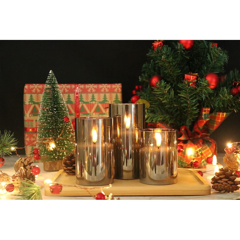 Eldnacele Eldnacele LED Kerzen mit Timerfunktion, flammenlose Kerzen mit Fernbedienung, elektrische Echtwachskerzen im Glas, flackernde Flamme 3-teilige led Kerzen-Set, Art Zimmer Deko, Grau