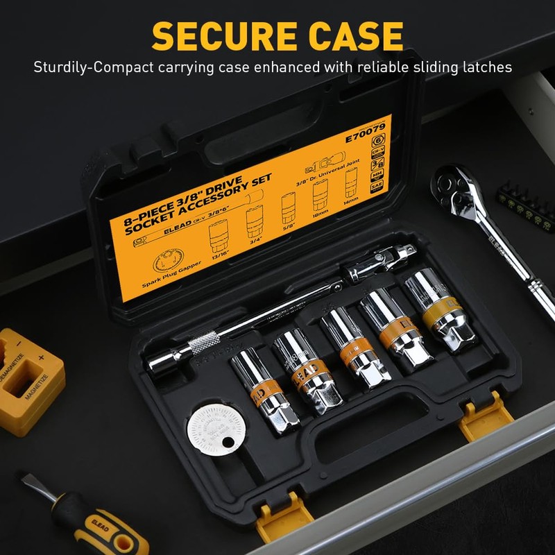 ELEAD ELEAD 8-Piece 3/8" Drive Spark Plug Socket Set with Universal Joint, Spark Plug Gapper and 6" Extension Bar, SAE & Metric, 5/8", 3/4", 13/16", 14mm, 18mm, CR-V Sockets with Rubber Holding Rings