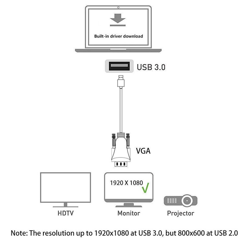- 【NOTE】ONLY FROM USB-TO-VGA Displays (TV/monitors). USB to VGA adapter cable is one-way design. Can NOT be used as a VGA-to-USB converter cable.