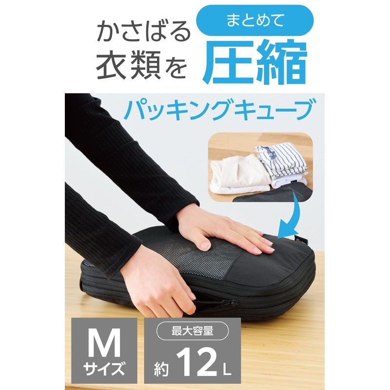 Elecom BMA-TRCS01MBK Travel Compression Bag, Packing Cube, Size M, 9.4 x 13.4 x 5.5 inches (12 L), 9.4 x 13.4 x 5.5 inches (24 x 34 x 14 cm), Double Sided Storage, Cordura, Heavy Duty YKK Zipper,