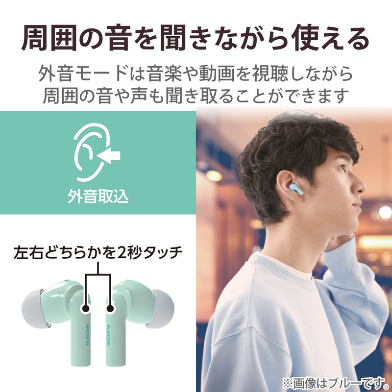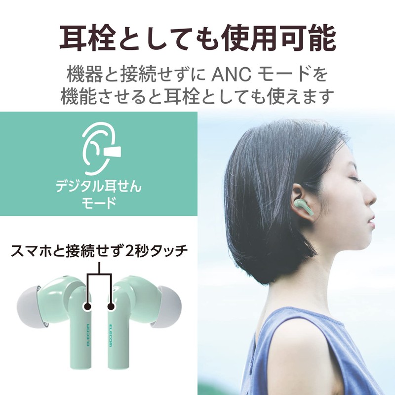 Elecom LBT-TWS15GN Wireless Earphones, Bluetooth 5.2, Noise Cancelling, AAC Compatible, Lightweight, Fully Wireless, Ear Plug Mode, Outsound Mode, Green
