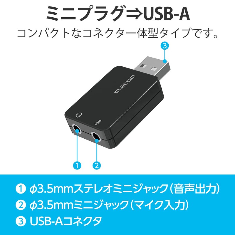 Elecom USB-AADC01BK USB Audio Converter Adapter φ3.5mm USB to Stereo Mini Jack 3 Pole 4 Pole Compatible Noise Reduction Direct Plug Type Black