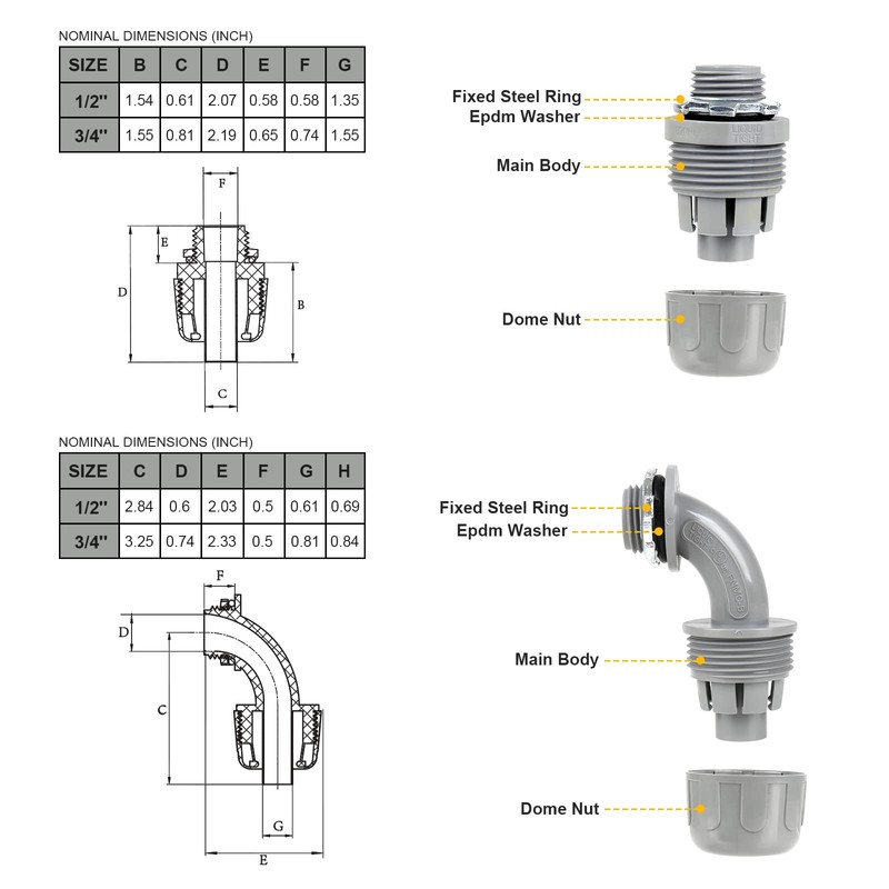 The Liquid-Tight Conduit Fits is fast, and only one person can complete the work in a few minutes. flexible conduit connector is safe to use and does not require any tools. you can simply tighten the dome sealing nut by pushing the conduit or pipe onto the ferrule