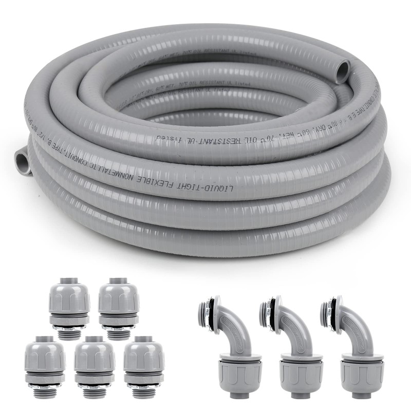 Elecoman 1-1/4 inch 25ft Liquid-Tight Conduit and Connector Kit,Flexible Non Metallic Liquid Tight Electrical Conduit Kit with 5 Straight and 3 90-Degree Conduit Connector Fittings,1in. Dia…