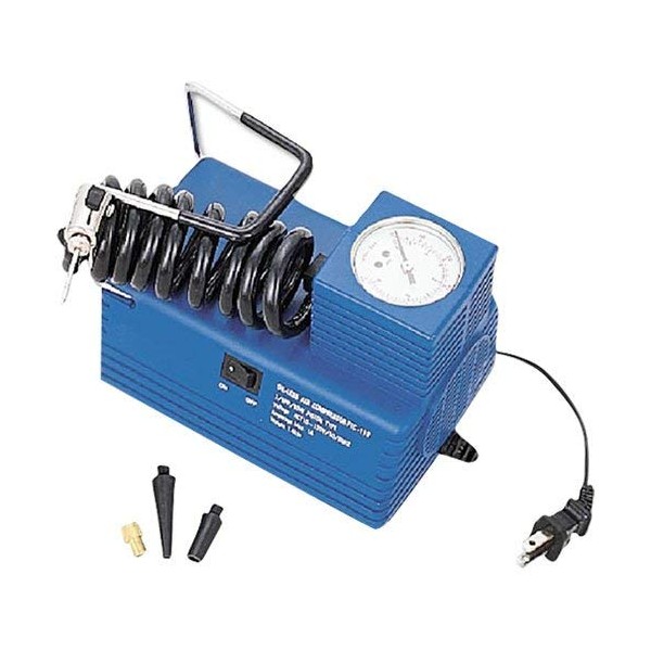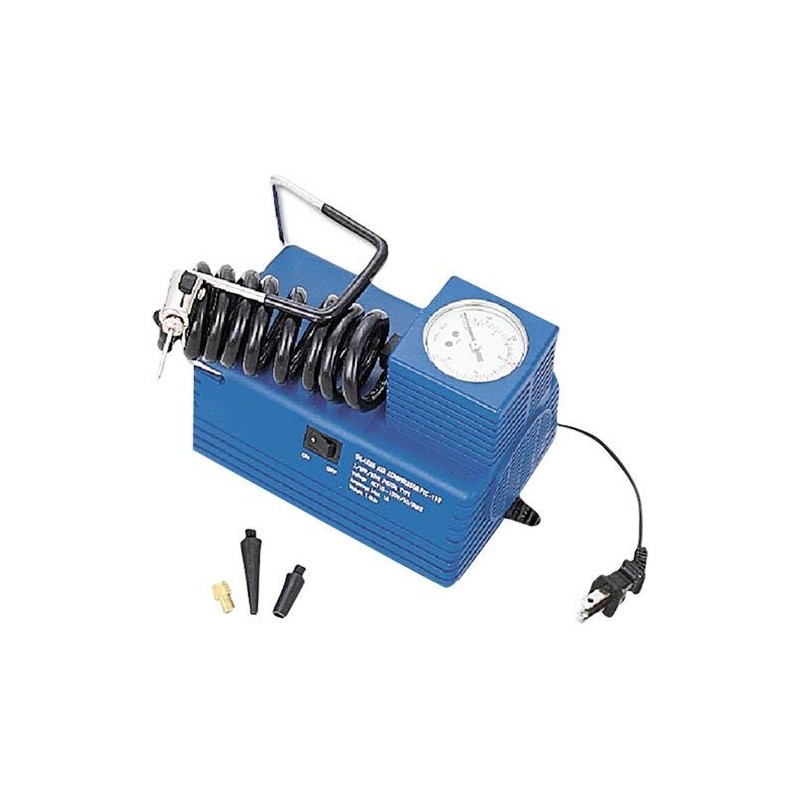 * Oil-less air compressor * High impact plastic with built-in handle * Coiled air hose extends 30" * 120 volt 1/8 HP