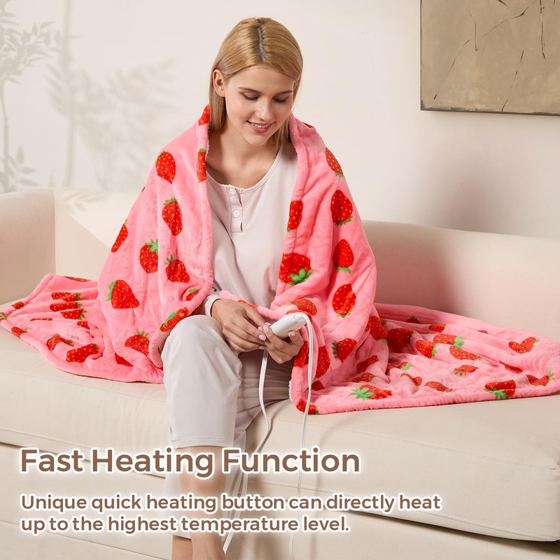 - Feel Unparalleled Comfort: With a flannel front and a sherpa reverse, our heated throw is skin-friendly, helps retain heat for added comfort, and gently wraps you in warmth on cold nights. Cute strawberry print perfect as a holiday gift for women, mother.