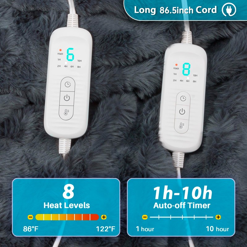 - 【Customized Warmth】Electric blanket offers 8 heat levels (86-122°F) and 1-10H auto-off timer settings for precise temperature control and customized comfort.