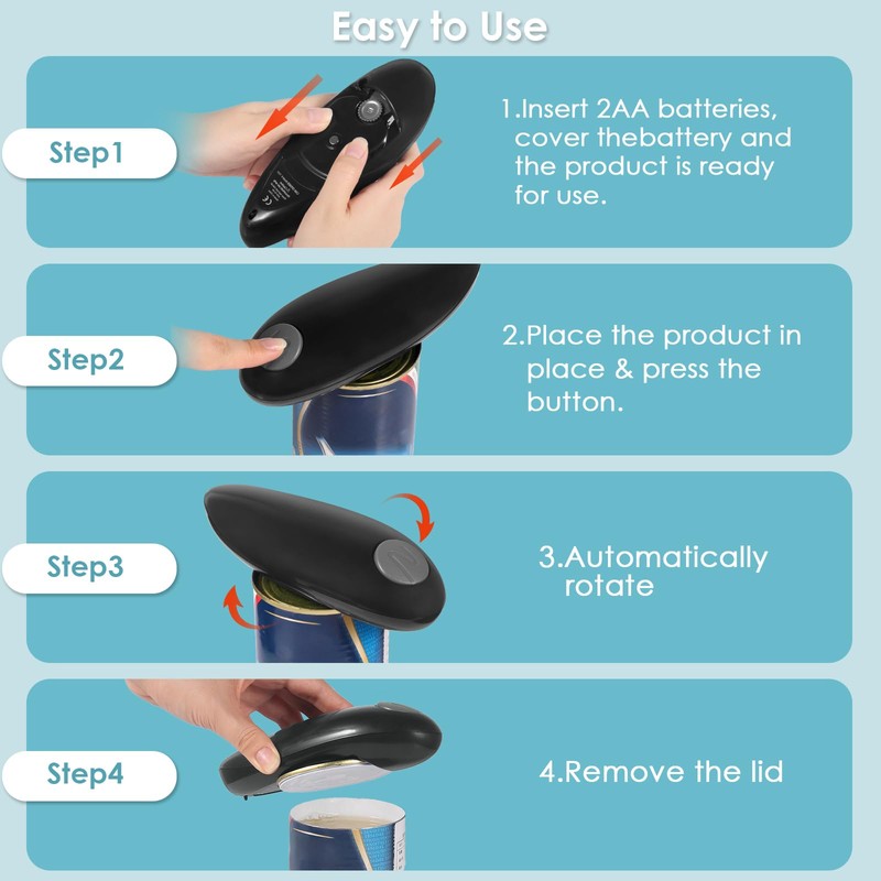 - ONE-TOUCH AUTOMATIC CAN OPENER – This convenient can opener features one-touch operation, offering twice the efficiency of traditional openers. Powered by two AA batteries, it smoothly wraps around the can's edge and automatically stops when done, making the process fast and hassle-free.