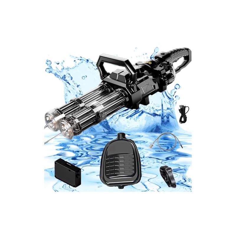 - ① Maximize your water warfare fun with the Electric Double Barrel Gatling! Say goodbye to constantly refilling water guns with its large capacity, making sure the battle lasts long without interruptions.