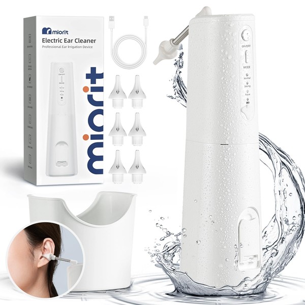 - 【Safe & Effective Ear Wax Removal】MIORIT Water Powered Ear Cleaner with food-grade TPU material earplugs. Our massaging five-jet stream helps gently loosen and prevent wax buildup.