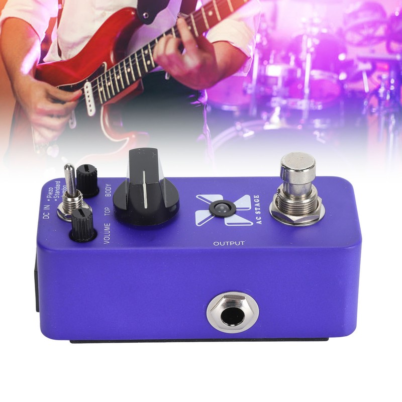 1、Acoustic Guitar Simulation Effect: This guitar effects pedal has an acoustic guitar simulation effect that converts the native sound of an electric guitar into a realistic box organ tone. 2、3 Adjustable Holes: This guitar pedal has three adjustable holes, volume level, body resonance and top hole, you can adjust them to achieve the effect you want and master the details of the sound curve. 3、3 Effects Modes: This electric guitar pedal has 3 effects modes, piezo, standard and jumbo modes, which can meet your different needs of using, very practical. 4、Excellent Aluminium Alloy Material: This mini guitar pedal is made of excellent aluminium alloy material, which is sturdy and durable, not easy to be damaged, and has a long service life. 5、Wide Application: This electric effects pedal has a wide range of applications and can be used for daily practice, stage performance and music recording etc.