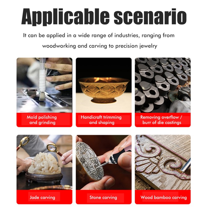 1、1. Comfortable grip - The well-designed engraving pen allows you to use it like a pencil for a comfortable feel, better control, and precise engraving. 2、2. Reliable quality - Made of high-strength metal and selected electronic parts, it is wear-resistant, wear-resistant, and has a long service life. 3、3. Easy to use - The wireless engraving pen can work normally without a plug, eliminating the problem of tangled wires. 4、4. High efficiency - This engraving pen can provide a high speed of up to 5000-10000-18000/min, providing an efficient engraving effect, adjustable in three gears, making engraving easier. 5、5. Rechargeable engraving pen - The electric engraving pen is powered by a lithium battery and can be recharged for use. No more disposable batteries! 6、6. Battery Indicator - Three bars for , two bars for 70%, and one bar for 30% to show reminders. 7、7. Wide uses - The pen can be used to engrave metal, ceramics, wood, pebbles, plastic, etc. Perfect for DIY projects or craft use.